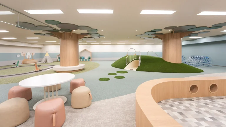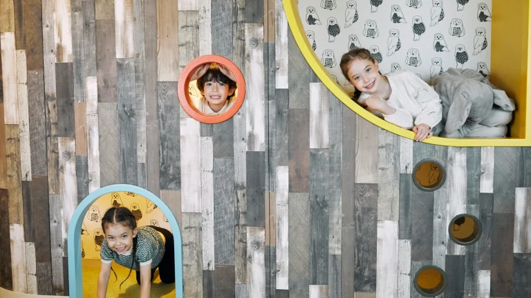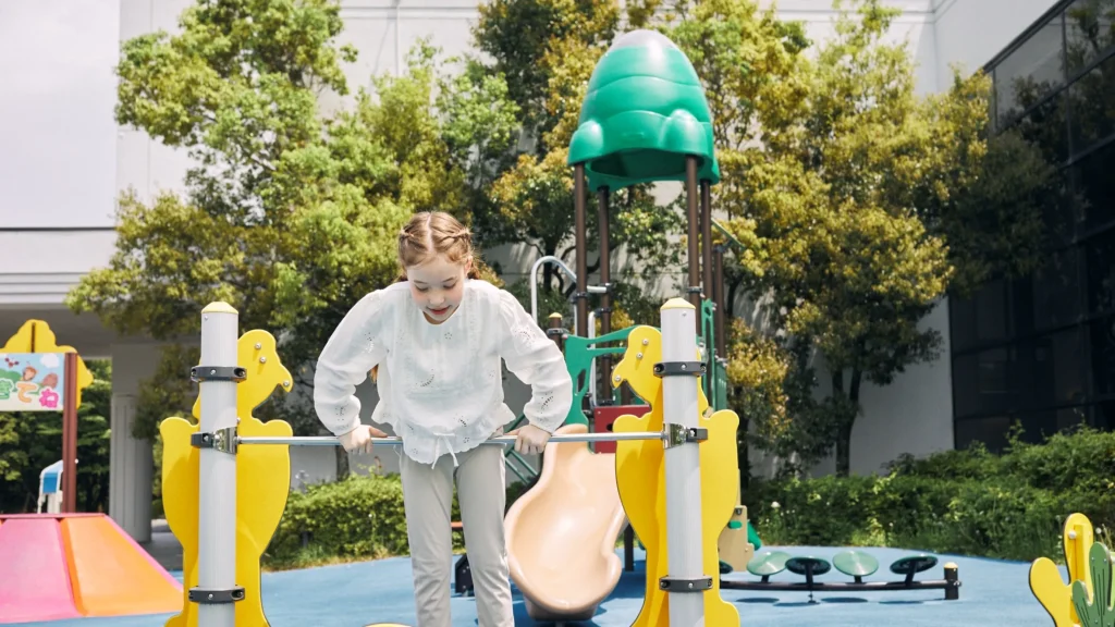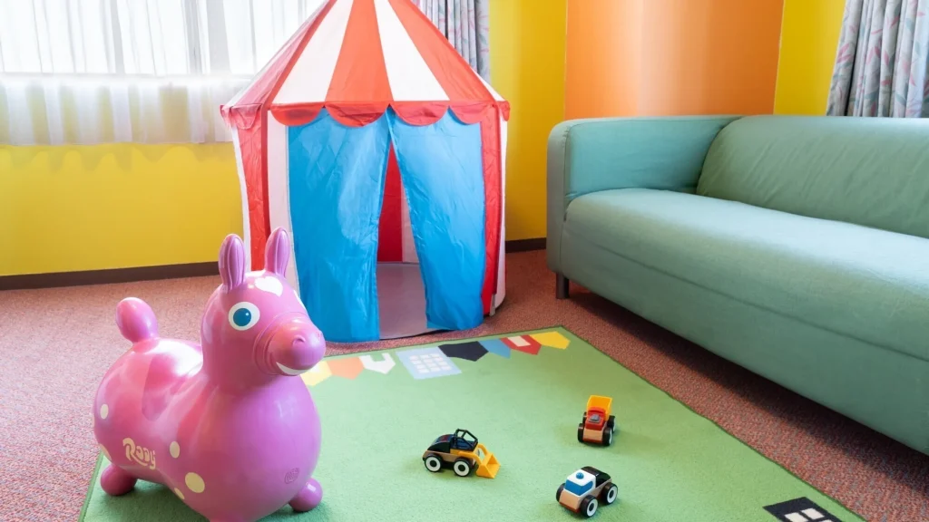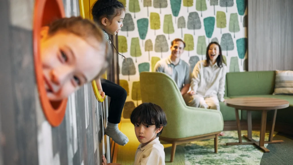 専用ファミリーフロア「サファリリゾート」は動物モチーフの部屋や広い遊び場があり、小さい子でものびのび遊べる設計。屋内・屋外の遊び場があり、天候に左右されず楽しめる。