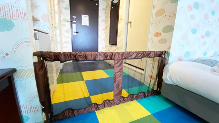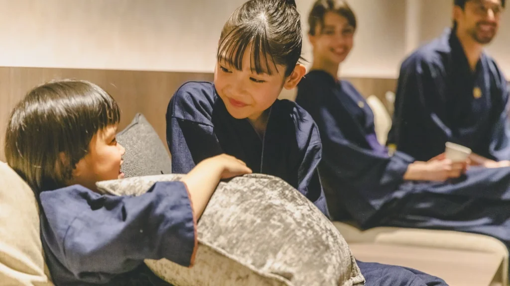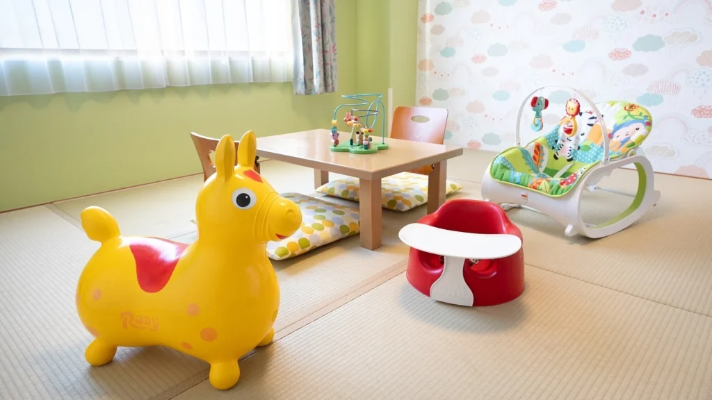 キッズエリアは丸みを帯びた素材で構成され、小さな子どもでも安心。客室には補助便座・踏み台・ミニベビーベッドなど貸出備品が充実。大浴場にはベビーバス、ベビーチェア、ベビーソープがあり、安全性に配慮されている。