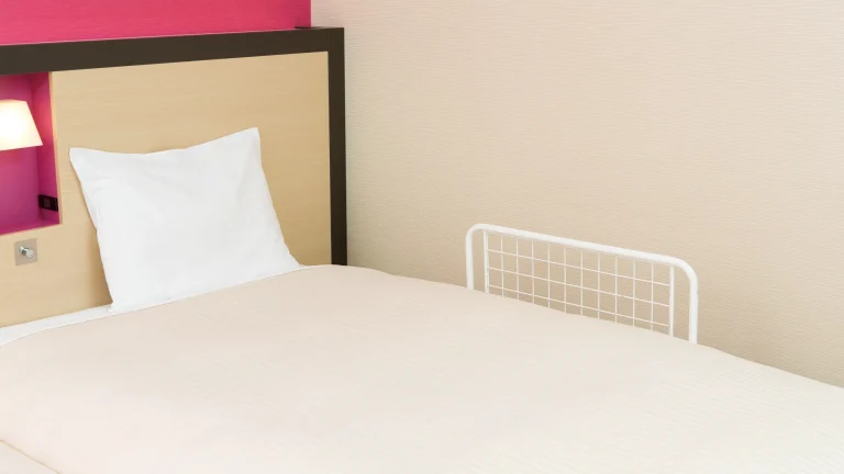 客室にはベッドガードや補助便座、踏み台が常備されており、館内移動も段差が少ない設計。カードキーによるセキュリティ管理も徹底されている