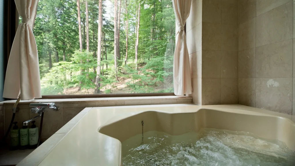 豊富な温泉設備で草津の湯を満喫できるほか、露天風呂やジャグジー、サウナ等でくつろげる。館内レストランやラウンジで季節料理や地元食材を楽しめ、森を望む景観の中でリラックス。ホテルスタッフは多言語対応もあり、幅広い年代が快適に過ごせる。