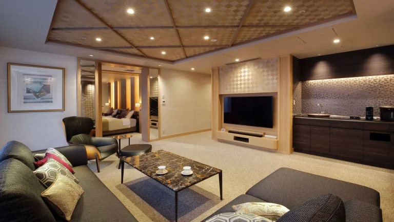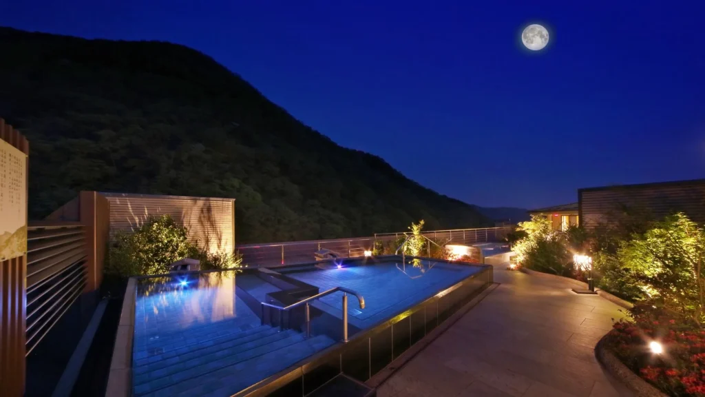 最上階の空中庭園露天風呂や多様な温泉施設で大人のリラックス時間を確保。豊富なブッフェやレストラン、ラウンジ・図書室など大人向け施設も充実し、家族旅行でも大人が静かに過ごせる空間が整う。